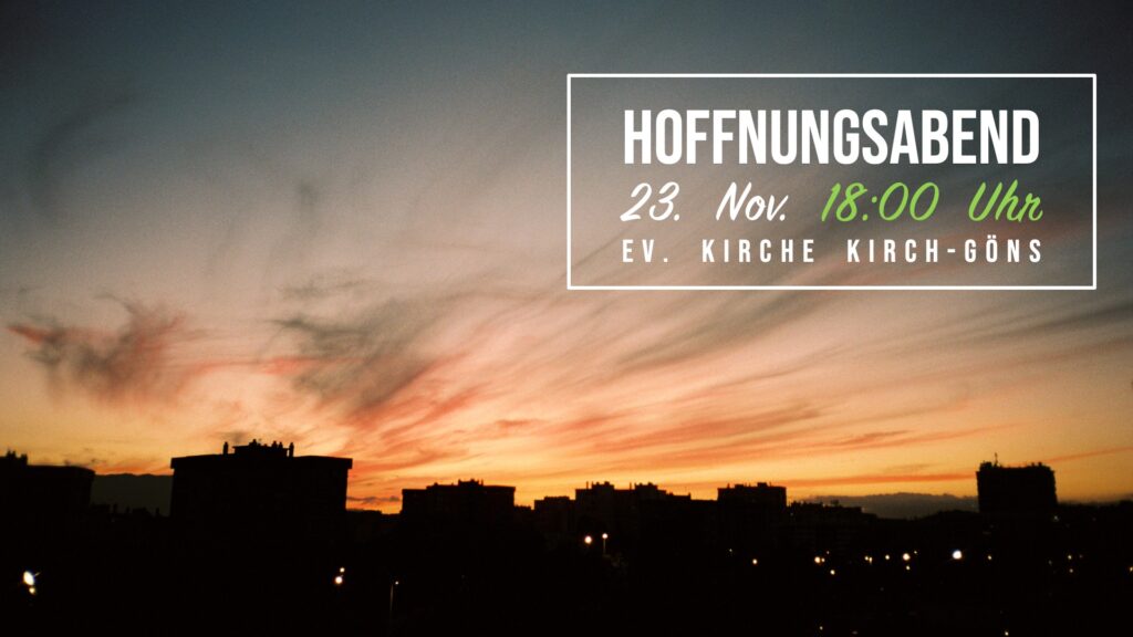 Am Sonntag, den 23.11.2025 findet in der Ev. Kirch in Kirch-Göns um 18.00 Uhr der nächste Hoffnungsabend statt. Lieder, Hoffnungsgeschichten und Gebete stehen im Mittelpunkt. Ihr seid herzlich eingeladen!