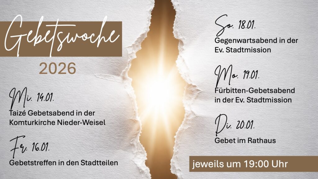 Auch dieses Jahr möchten wir mit Gebet ins neue Jahr starten und laden ganz herzlich ein zu unserer Gebetswoche. Wir möchten an verschiedenen Orten in Butzbach und den Stadtteilen für die Menschen, die Vereine, Schulen, Einrichtungen und Ämter beten und Segen an diese Orte bringen.