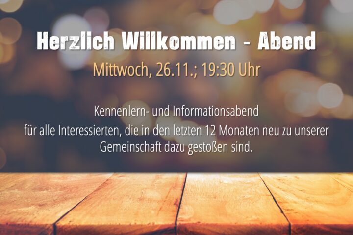 Bist du in den letzten 12 Monaten neu zu unserer Gemeinschaft dazu gestoßen? Dann fühl‘ dich herzlich eingeladen zum Willkommens-Abend am 26.11.2025 um 19:30 Uhr im Bistro des Gemeindezentrums!Du erhältst einige Informationen aus der Gemeinde und kannst deine Fragen stellen. Aber natürlich soll auch das gegenseitige Kennenlernen und Erzählen Raum haben bei diesem Treffen. Wir freuen uns auf dich!