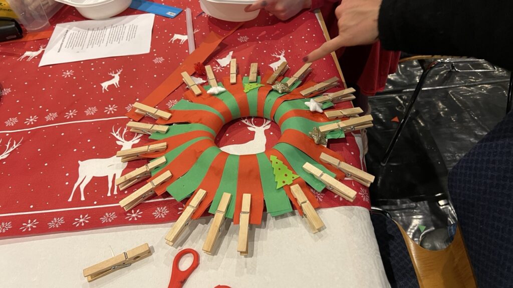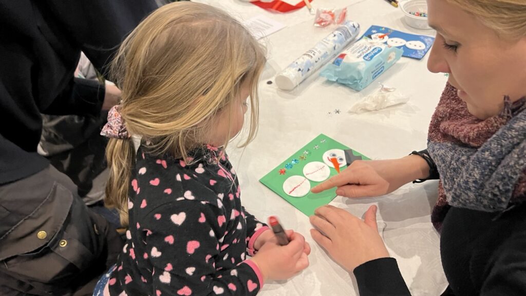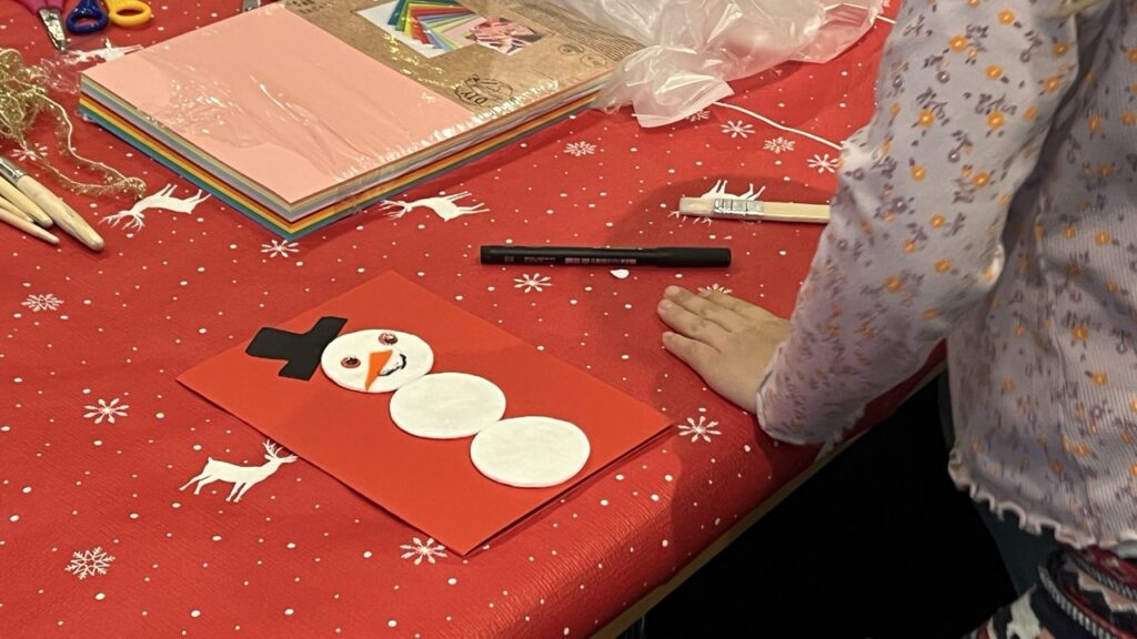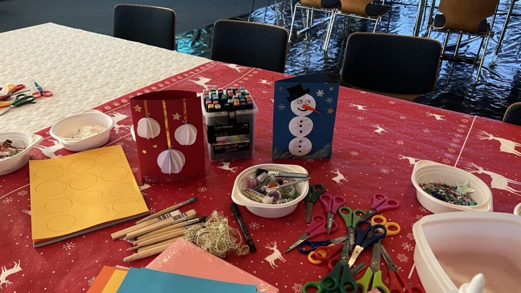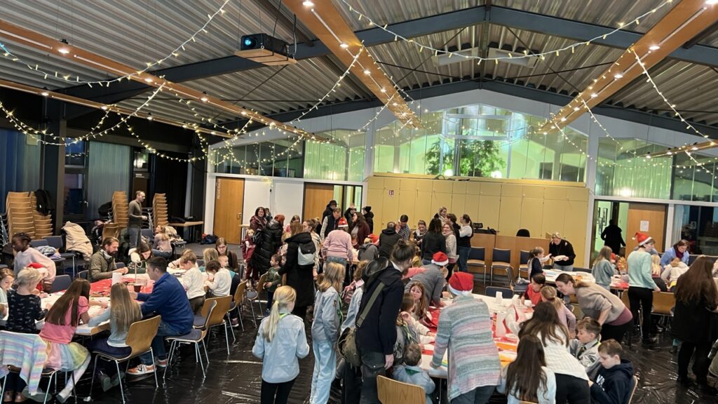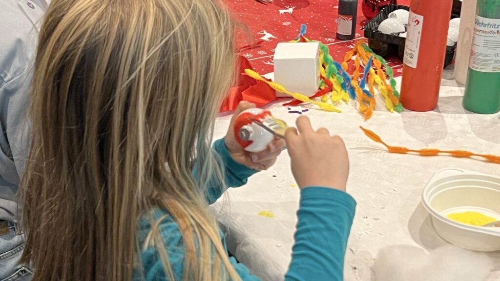 Nach dem gemeinsamen Start verteilten sich Kinder und Eltern im gesamten Gemeindezentrum, genossen Crepes, Brezeln und Punsch und kamen zum Basteln und Gestalten von Weihnachtsgeschenken in den großen Saal. Weihnachtskarten, Türkränze, Weihnachtskugeln, Baumschmuck und tolle Geschenkedosen – es war für jeden etwas dabei. An den Tischen war jede Menge Bastelmaterial für Große und Kleine vorbereitet und so entstanden in zwei Stunden wunderschöne Geschenke. Mit viel Ausdauer und Kreativität bastelten Eltern mit ihren Kids, hatten jede Menge Spaß. Die Helfer an den Tischen gaben Tipps und zeigten, wie aus Fingerabdrücken Schneemänner entstehen oder wie man aus Partytellern Türkränze bastelt.